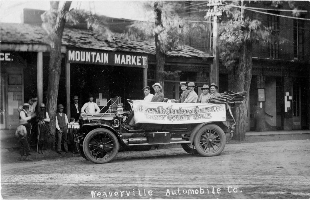 An early Weaverville Chamber of Commerce parade scene in downtown Weaverville, CA, featuring community members riding through town with a Chamber banner during the early 1900s.