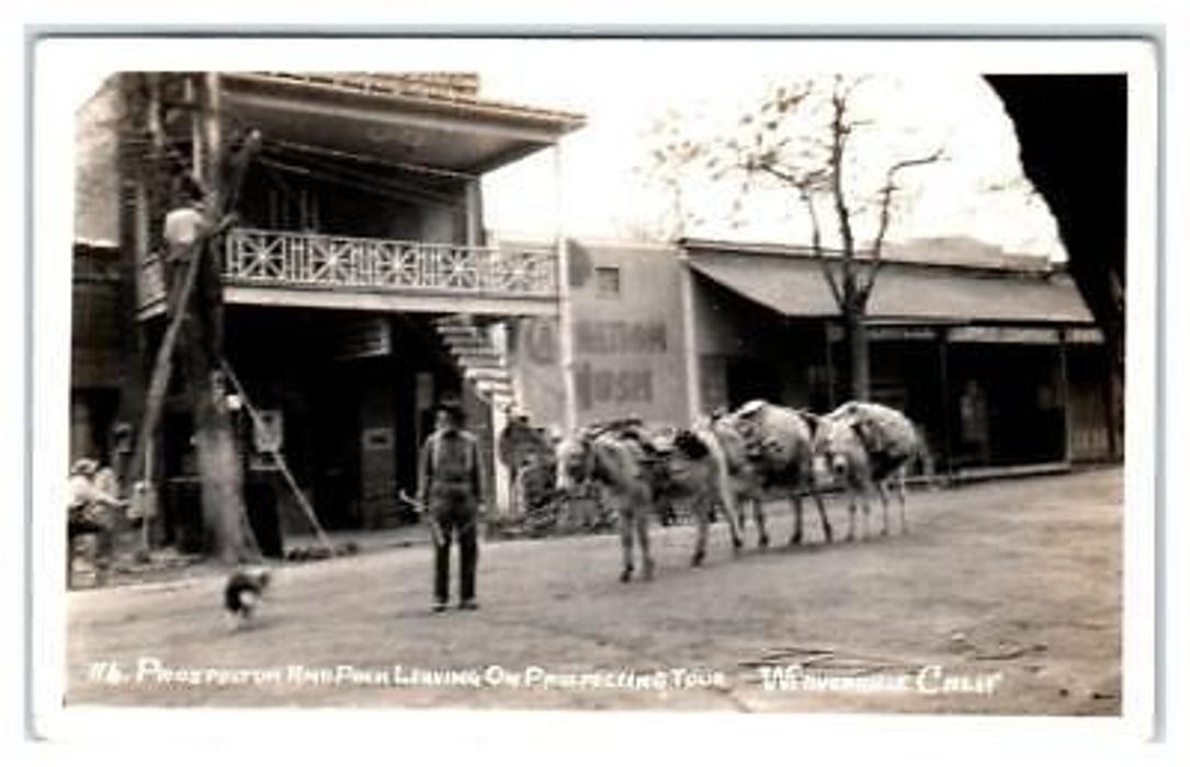 Historic Weaverville, CA, showing pack animals loaded with supplies moving through downtown during the Gold Rush era, a reminder of how goods and commerce once flowed through Trinity County.
