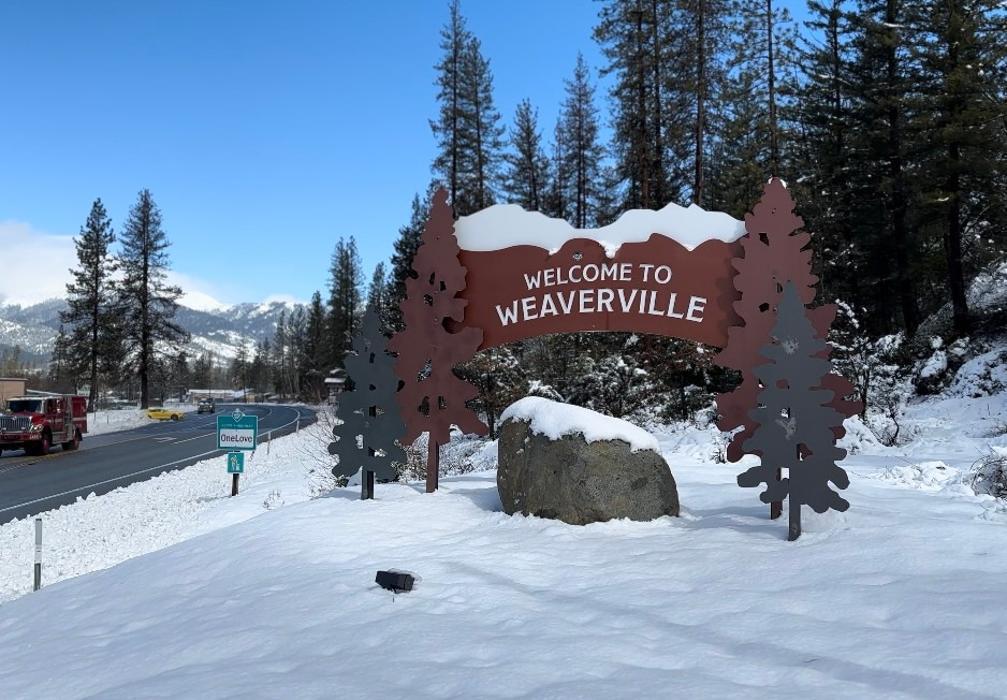 The Welcome to Weaverville sign in Weaverville, CA, set against snowy landscapes, pine trees, and mountain views in Trinity County.
