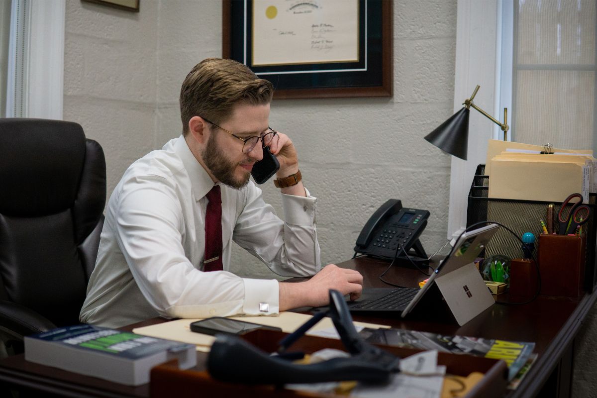 Calum Welch Norfolk criminal defense attorney talking with a client on the phone