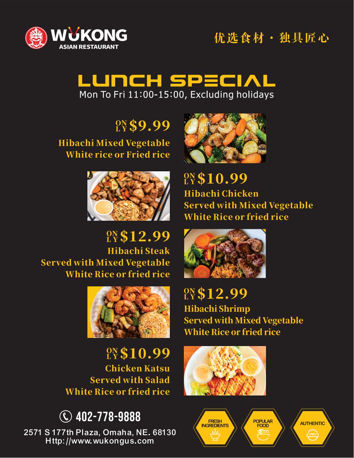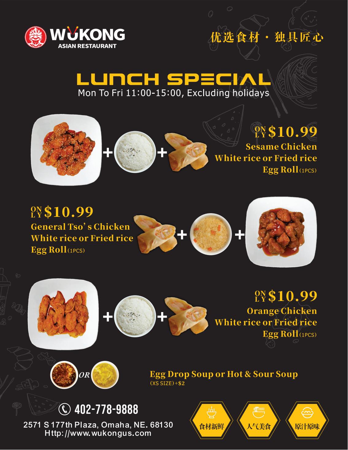 Welcome to Wukong Asian Restaurant, your go-to spot for delectable Asian cuisine in Omaha, NE! Indulge in a culinary journey like no other as you savor authentic Asian flavors right here in the heart of the city. From savory seafood dishes to mouthwatering beef noodles, our restaurant offers a diverse menu that caters to all taste buds. Whether you're craving flavorful noodles or looking for the perfect place for a delightful meal, Wukong Asian Restaurant is here to satisfy your every culinary desire.