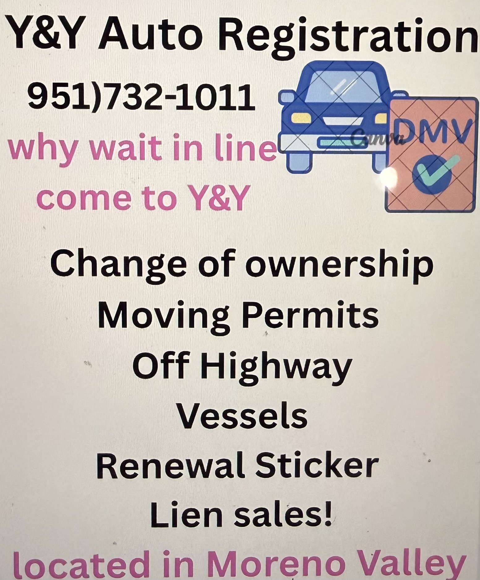| Tags | car registrations, car tags, vehicle verification, DMV services, auto registration near me, car title services, vehicle tag renewal, VIN verification, auto registration service, same day car registration, DMV appointment help, license plate services, auto paperwork services, registration renewal, mobile VIN verification, car tag replacement, vehicle title transfer, auto documentation services, car registration company, fast DMV services |